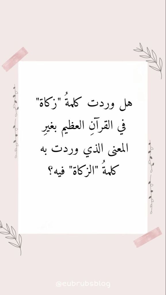 ولقد وردت في القرآنِ العظيم كلمةُ “زكاة” بمعنى هو ذات المعنى أعلاه: (وَمَا آتَيْتُمْ مِنْ رِبًا لِيَرْبُوَ فِي أَمْوَالِ النَّاسِ فَلَا يَرْبُو عِنْدَ اللَّهِ وَمَا آتَيْتُمْ مِنْ زَكَاةٍ تُرِيدُونَ وَجْهَ اللَّهِ فَأُولَئِكَ هُمُ الْمُضْعِفُونَ) (39 الروم).