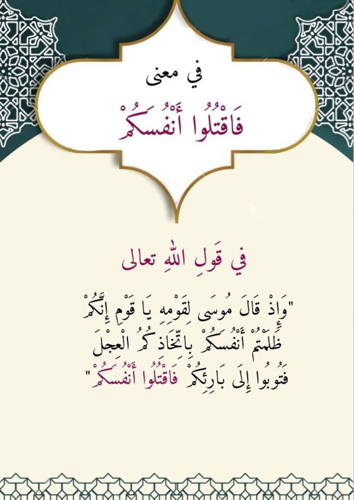فسيدُنا موسى كان يعجلُ أحياناً في إصدارِ حكمِه على الأشياء، ومن ذلك حكمُه على ما فعلَه الخضر مما تقدَّم ذكرُه: (قَالَ أَخَرَقْتَهَا لِتُغْرِقَ أَهْلَهَا لَقَدْ جِئْتَ شَيْئًا إِمْرًا (من 71 الكهف))، (قَالَ أَقَتَلْتَ نَفْسًا زَكِيَّةً بِغَيْرِ نَفْسٍ لَقَدْ جِئْتَ شَيْئًا نُكْرًا (من 74 الكهف))، (قَالَ لَوْ شِئْتَ لَاتَّخَذْتَ عَلَيْهِ أَجْرًا (من 77 الكهف)). ولذلك فليس بالأمرِ المستغرب أن يبادرَ سيدُنا موسى فيأمرَ قومَه بأن يقتلَ بعضُهم بعضاً، وذلك إثرَ عودتِه إليهم من خلوتِه مع اللهِ تعالى والتي نبَّأه اللهُ تعالى فيها بأنَّ قومَه قد اتخذوا العجلَ إلهاً. فكان أن نبَّأه اللهُ تعالى، وهو نبيُّه وكليمُه، بأنَّه قد تابَ عليهم، وذلك لكي يحولَ دون أن يقتلَ قومُه بعضُهم بعضاً: (إِذْ قَالَ مُوسَى لِقَوْمِهِ يَا قَوْمِ إِنَّكُمْ ظَلَمْتُمْ أَنْفُسَكُمْ بِاتِّخَاذِكُمُ الْعِجْلَ فَتُوبُوا إِلَى بَارِئِكُمْ فَاقْتُلُوا أَنْفُسَكُمْ ذَلِكُمْ خَيْرٌ لَكُمْ عِنْدَ بَارِئِكُمْ فَتَابَ عَلَيْكُمْ إِنَّهُ هُوَ التَّوَّابُ الرَّحِيمُ) (54 البقرة).