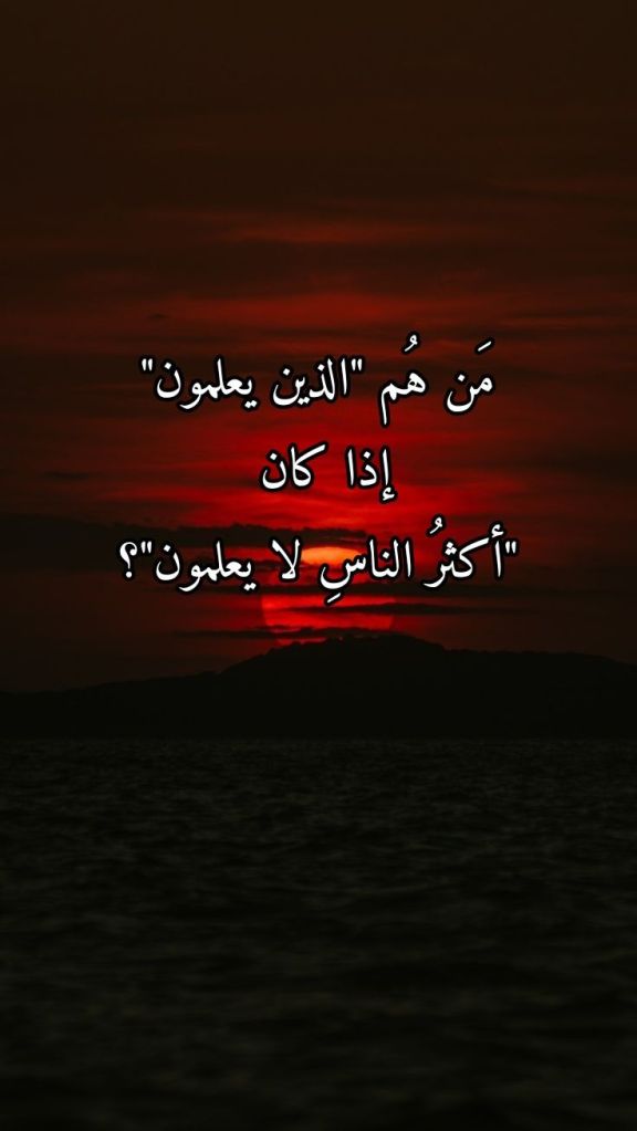 عرَّفَ اللهُ تعالى في قرآنِه العظيم “الذين لا يعلمون” بأنَّ “عِلمَهم مقصورٌ على ظاهرِ الحياةِ الدنيا فحسب”: (وَلَكِنَّ أَكْثَرَ النَّاسِ لَا يَعْلَمُونَ. يَعْلَمُونَ ظَاهِرًا مِنَ الْحَيَاةِ الدُّنْيَا). ولذلك فإنَّ بإمكاننا أن نُعرِّفَ “الذين يعلمون” بأنَّ “عِلمَهم يطالُ ظاهرَ الحياةِ الدنيا وباطنَها، وذلك طالما كان عِلمُهم بباطنِ هذه الحياةِ الدنيا قد تأتَّى لهم الحصولُ عليه بما كفلَه لهم تدبُّرُهم لقرآنِ اللهِ العظيم الذي لولاه ما كانوا ليعلموا أنَّ الآخرةَ آتيةٌ لا ريبَ فيها، وأنَّ باطنَ هذه الحياةِ الدنيا يشهدُ بذلك.