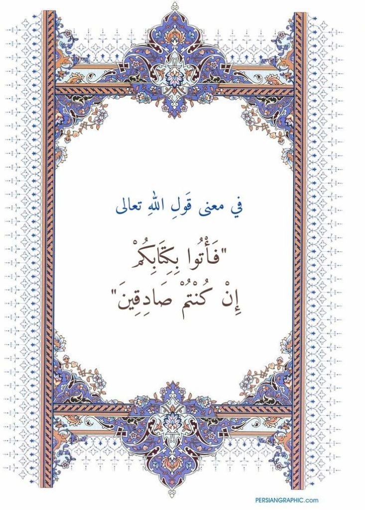 1- (قُلْ أَرَأَيْتُمْ مَا تَدْعُونَ مِنْ دُونِ اللَّهِ أَرُونِي مَاذَا خَلَقُوا مِنَ الْأَرْضِ أَمْ لَهُمْ شِرْكٌ فِي السَّمَاوَاتِ اِئْتُونِي بِكِتَابٍ مِنْ قَبْلِ هَذَا أَوْ أَثَارَةٍ مِنْ عِلْمٍ إِنْ كُنْتُمْ صَادِقِينَ) (4 الأحقاف).
