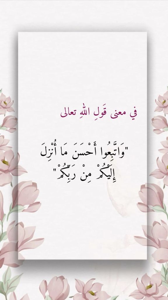 نقرأُ في سورةِ الزمر، وفي الآيةِ الكريمة 55 منها، قَولَ اللهِ تعالى: (وَاتَّبِعُوا أَحْسَنَ مَا أُنْزِلَ إِلَيْكُمْ مِنْ رَبِّكُمْ مِنْ قَبْلِ أَنْ يَأْتِيَكُمُ الْعَذَابُ بَغْتَةً وَأَنْتُمْ لَا تَشْعُرُونَ). فما هو معنى “وَاتَّبِعُوا أَحْسَنَ مَا أُنْزِلَ إِلَيْكُمْ مِنْ رَبِّكُمْ” في هذه الآيةِ الكريمة؟