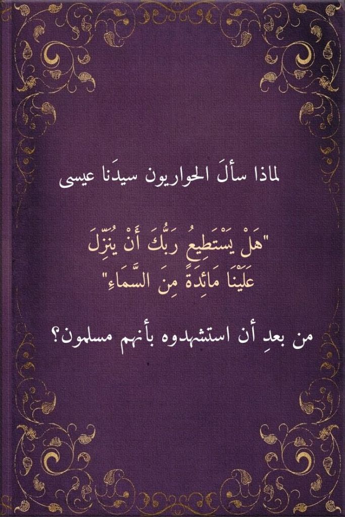 نقرأُ في سورةِ المائدة، وفي الآيةِ الكريمة 111 منها، قولَ اللهِ تعالى: (وَإِذْ أَوْحَيْتُ إِلَى الْحَوَارِيِّينَ أَنْ آمِنُوا بِي وَبِرَسُولِي قَالُوا آمَنَّا وَاشْهَدْ بِأَنَّنَا مُسْلِمُونَ). يُبيِّنُ لنا تدبُّرُ هذه الآيةِ الكريمة أنَّ الحواريين أقرُّوا بأنهم قد آمنوا إيماناً استشهدوا اللهَ تعالى عليه. كما ونقرأُ في الآيةِ الكريمة 112 من سورةِ المائدة: (إِذْ قَالَ الْحَوَارِيُّونَ يَا عِيسَى ابْنَ مَرْيَمَ هَلْ يَسْتَطِيعُ رَبُّكَ أَنْ يُنَزِّلَ عَلَيْنَا مَائِدَةً مِنَ السَّمَاءِ قَالَ اتَّقُوا اللَّهَ إِنْ كُنْتُمْ مُؤْمِنِين). فلماذا سألَ الحواريون سيدَنا عيسى “هَلْ يَسْتَطِيعُ رَبُّكَ أَنْ يُنَزِّلَ عَلَيْنَا مَائِدَةً مِنَ السَّمَاءِ” من بعد أن استشهدوه بأنهم مسلمون؟