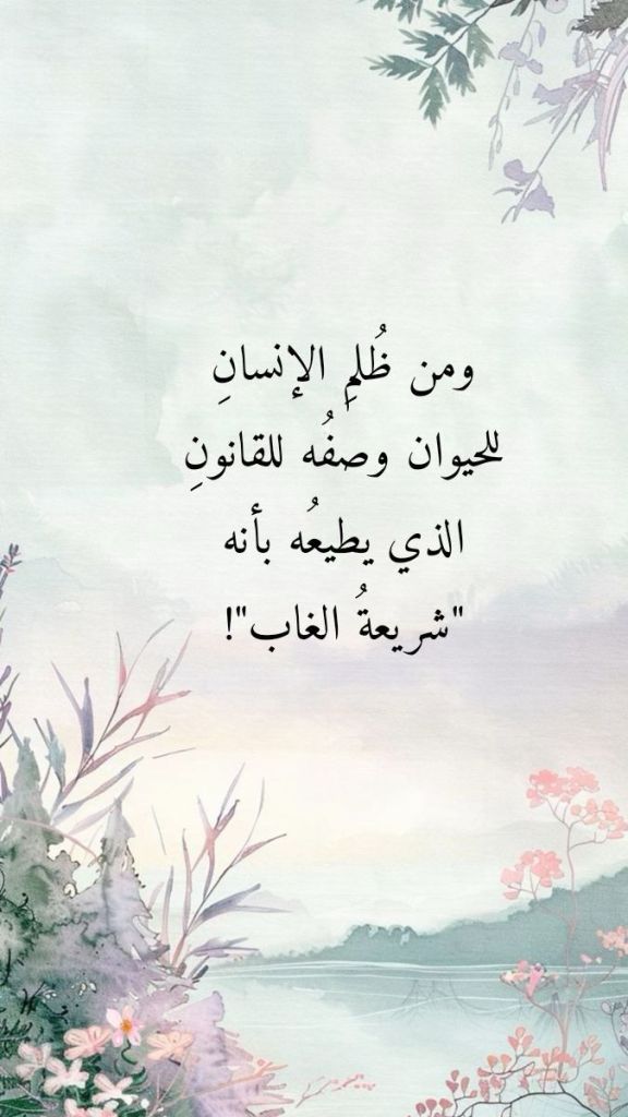 يتبيَّنُ لنا، وبتدبُّرِ ما تقدَّم، أنَّ “شِرعةَ الغاب” هي شرعةُ اللهِ التي نظَّمَ بها شؤونَ الحيوانِ قويِّه وضعيفِه، وبالكيفيةِ التي تكفلُ للكلِّ أن يتعايشَ فيها تعايشاً ليس فيه عدوانٌ ظالمٌ ولا طغيان، وبما يؤمِّنُ بقاءَ الأرانبِ والسناجبِ، وغيرِهما من ضعيفِ الحيوان، في غابةٍ تمتلئُ بالأسودِ والنمورِ وغيرِها من قويِّ الحيوان.