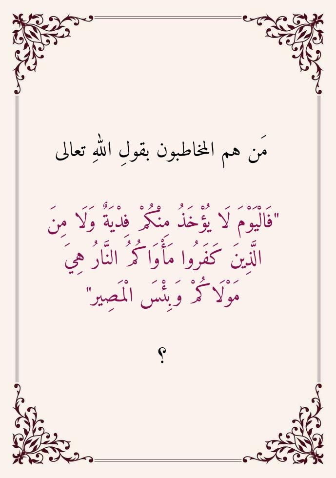 نقرأُ في سورةِ الحديد، وفي الآيتَين الكريمتَين 14- 15 منها، قولَ اللهِ تعالى: (يُنَادُونَهُمْ أَلَمْ نَكُنْ مَعَكُمْ قَالُوا بَلَى وَلَكِنَّكُمْ فَتَنْتُمْ أَنْفُسَكُمْ وَتَرَبَّصْتُمْ وَارْتَبْتُمْ وَغَرَّتْكُمُ الْأَمَانِيُّ حَتَّى جَاءَ أَمْرُ اللَّهِ وَغَرَّكُمْ بِاللَّهِ الْغَرُورُ. فَالْيَوْمَ لَا يُؤْخَذُ مِنْكُمْ فِدْيَةٌ وَلَا مِنَ الَّذِينَ كَفَرُوا مَأْوَاكُمُ النَّارُ هِيَ مَوْلَاكُمْ وَبِئْسَ الْمَصِيرُ).