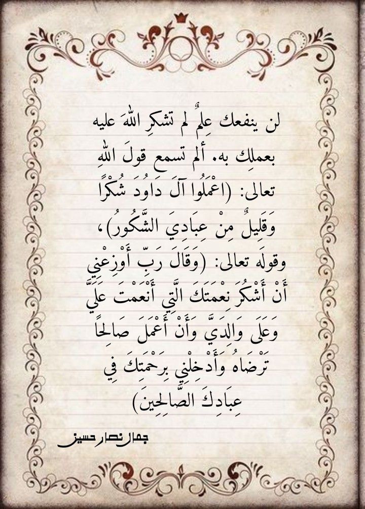 لن ينفعك عِلمٌ لم تشكرِ اللهَ عليه بعملِك به. ألم تسمع قولَ اللهِ تعالى: (اعْمَلُوا آلَ دَاوُدَ شُكْرًا وَقَلِيلٌ مِنْ عِبَادِيَ الشَّكُورُ)، وقولَه تعالى: (وَقَالَ رَبِّ أَوْزِعْنِي أَنْ أَشْكُرَ نِعْمَتَكَ الَّتِي أَنْعَمْتَ عَلَيَّ وَعَلَى وَالِدَيَّ وَأَنْ أَعْمَلَ صَالِحًا تَرْضَاهُ وَأَدْخِلْنِي بِرَحْمَتِكَ فِي عِبَادِكَ الصَّالِحِينَ).