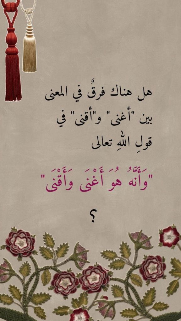 فرَّقَ لسانُ القرآنِ العربيُّ المبين بين كلمةِ “أغنى” وكلمةِ “أقنى” اللتين وردتا في قولِ اللهِ تعالى (وَأَنَّهُ هُوَ أَغْنَى وَأَقْنَى)” (48 النجم). فالإغناءُ هو ضديدُ الإفقار، أما “الإقناء” فهو الزيادةُ في الإغناء حتى يصبحَ من أغناهُ اللهُ تعالى واسعَ الثراء، فإن زادَ في إغنائه فجعلَه من الذين يكنزون الذهبَ والفضة فقد أقناه وجعله مثل قارون الذي وصف ما حباه به من ثراءٍ منقطع النظير بقولِه (إِنَّ قَارُونَ كَانَ مِنْ قَوْمِ مُوسَى فَبَغَى عَلَيْهِمْ وَآتَيْنَاهُ مِنَ الْكُنُوزِ مَا إِنَّ مَفَاتِحَهُ لَتَنُوءُ بِالْعُصْبَةِ أُولِي الْقُوَّةِ) (من 76 القصص).