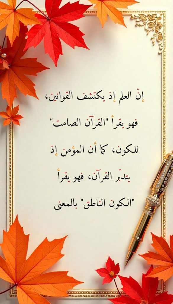 إنّ العلم إذ يكتشف القوانين، فهو يقرأ “القرآن الصامت” للكون، كما أن المؤمن إذ يتدبّر القرآن، فهو يقرأ “الكون الناطق” بالمعنى.