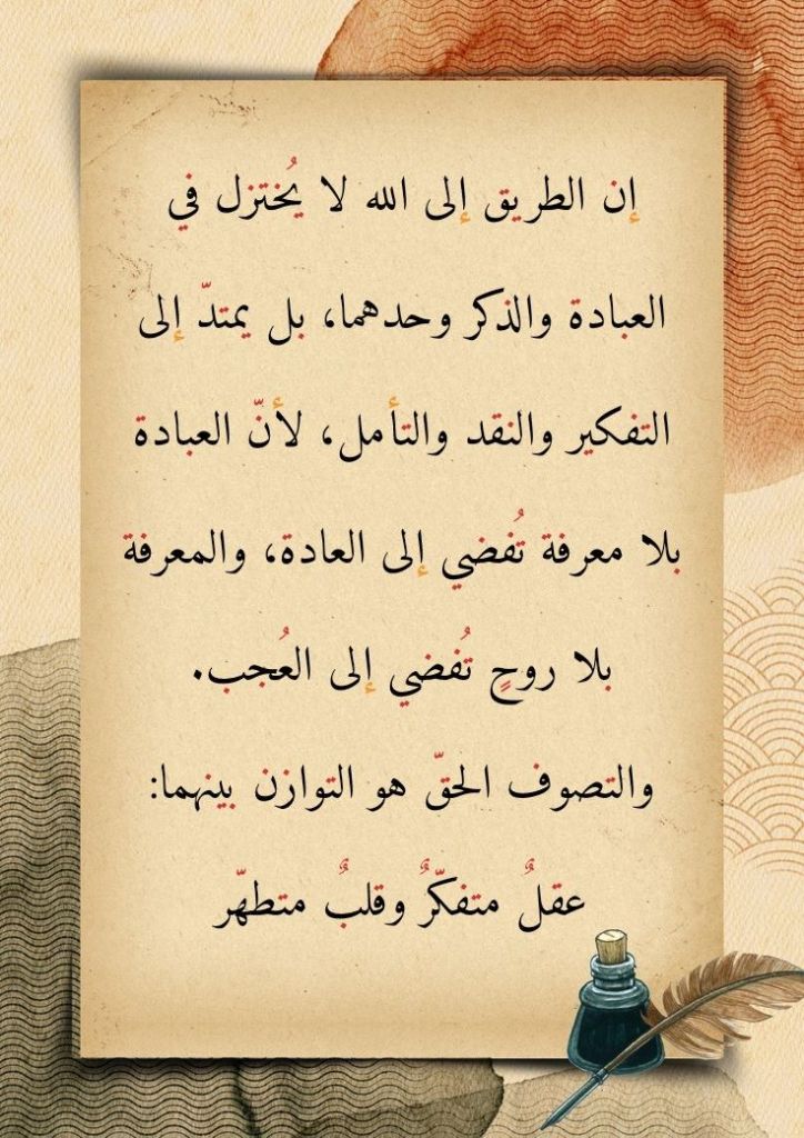 وعليه، فإن الطريق إلى الله لا يُختزل في العبادة والذكر وحدهما، بل يمتدّ إلى التفكير والنقد والتأمل، لأنّ العبادة بلا معرفة تُفضي إلى العادة، والمعرفة بلا روحٍ تُفضي إلى العُجب. والتصوف الحقّ هو التوازن بينهما: عقلٌ متفكّرٌ وقلبٌ متطهّر.
