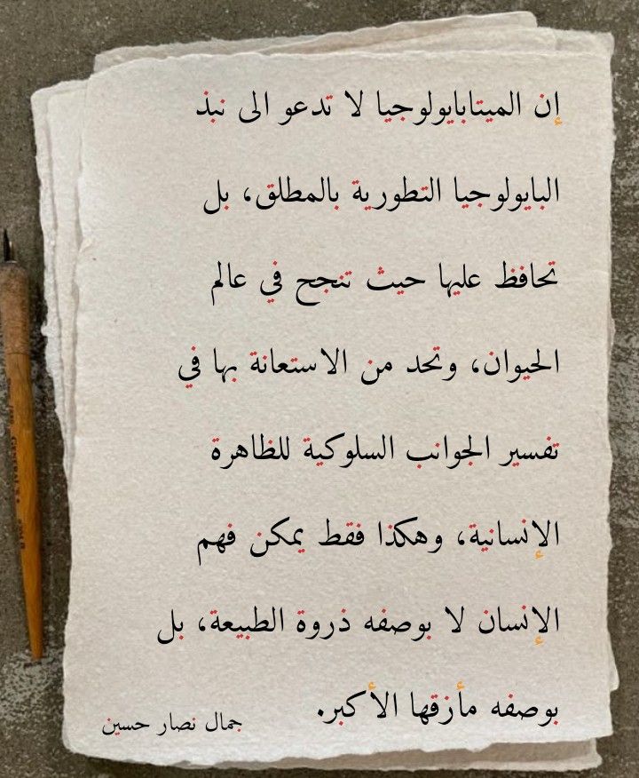إن الميتابايولوجيا، بهذا المعنى، لا تدعو الى نبذ البايولوجيا التطورية بالمطلق، بل تحافظ عليها حيث تنجح في عالم الحيوان، وتحد من الاستعانة بها في تفسير الجوانب السلوكية للظاهرة الإنسانية، وهكذا فقط يمكن فهم الإنسان لا بوصفه ذروة الطبيعة، بل بوصفه مأزقها الأكبر.