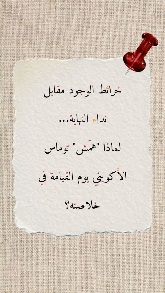 يتبين لنا، وبتدبر كل ما تقدم، أن الأكويني كان يحاول “تأثيل” (Etymologize) الوجود منطقياً، والمنطق بطبعه يميل إلى الاستقرار والقوانين، بينما يمثل يوم القيامة تداعياً فجائياً للمنطق البشري، وبكيفية تعجز قوانين أرسطو عن فهمها ناهيك عن تقبُّلها والقبول بها. وهنا لابد من التشديد على حقيقة مفادها أن تداعي “المنطق البشري” لا يقتصر على عالم الآخرة وأحداثه، وهذا التداعي هو عين ما يحدث في المعجزات: تلك الظواهر التي يستعصي على العقل أمر التعليل لما يجري فيها من خرق بيِّن لقوانين العلم الذي بين أيدينا.
