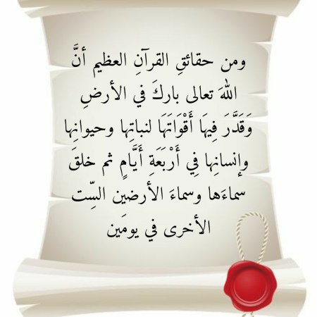 ومن حقائقِ القرآنِ العظيم أنَّ اللهَ تعالى باركَ في الأرضِ وَقَدَّرَ فِيهَا أَقْوَاتَهَا لنباتِها وحيوانِها وإنسانِها فِي أَرْبَعَةِ أَيَّامٍ ثم خلقَ سماءَها وسماءَ الأرضين السِّت الأخرى في يومَين