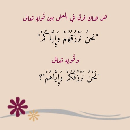 هل هناك فرقٌ في المعنى بين قَولِهِ تعالى “نَحْنُ نَرْزُقُهُمْ وَإِيَّاكُمْ” وقَولِهِ تعالى “نَحْنُ نَرْزُقُكُمْ وَإِيَّاهُمْ”؟