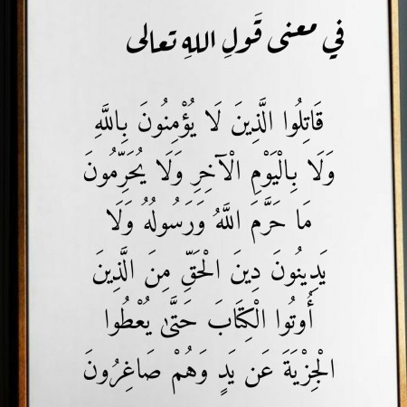 في معنى قَولِ اللهِ تعالى “قَاتِلُوا الَّذِينَ لَا يُؤْمِنُونَ بِاللَّهِ وَلَا بِالْيَوْمِ الْآخِرِ وَلَا يُحَرِّمُونَ مَا حَرَّمَ اللَّهُ وَرَسُولُهُ وَلَا يَدِينُونَ دِينَ الْحَقِّ مِنَ الَّذِينَ أُوتُوا الْكِتَابَ حَتَّىٰ يُعْطُوا الْجِزْيَةَ عَن يَدٍ وَهُمْ صَاغِرُونَ”