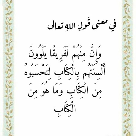 في معنى قَولِ اللهِ تعالى “وَإِنَّ مِنْهُمْ لَفَرِيقًا يَلْوُونَ أَلْسِنَتَهُم بِالْكِتَابِ لِتَحْسَبُوهُ مِنَ الْكِتَابِ وَمَا هُوَ مِنَ الْكِتَابِ”