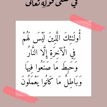 في معنى قولِهِ تعالى “أُولَٰئِكَ الَّذِينَ لَيْسَ لَهُمْ فِي الْآخِرَةِ إِلَّا النَّارُ وَحَبِطَ مَا صَنَعُوا فِيهَا وَبَاطِلٌ مَا كَانُوا يَعْمَلُونَ”