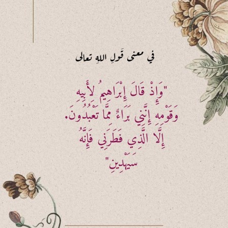 في معنى قَولِ اللهِ تعالى “وَإِذْ قَالَ إِبْرَاهِيمُ لِأَبِيهِ وَقَوْمِهِ إِنَّنِي بَرَاءٌ مِمَّا تَعْبُدُونَ. إِلَّا الَّذِي فَطَرَنِي فَإِنَّهُ سَيَهْدِينِ”