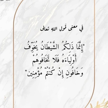 في معنى قَولِ اللهِ تعالى “إِنَّمَا ذَلِكُمُ الشَّيْطَانُ يُخَوِّفُ أَوْلِيَاءَهُ فَلَا تَخَافُوهُمْ وَخَافُونِ إِنْ كُنْتُمْ مُؤْمِنِين”