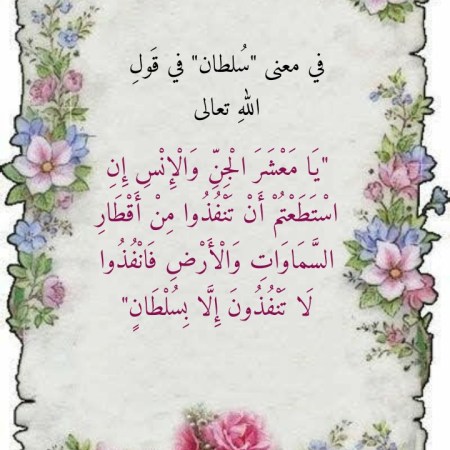 في معنى “سُلطان” في قَولِ اللهِ تعالى “يَا مَعْشَرَ الْجِنِّ وَالْإِنْسِ إِنِ اسْتَطَعْتُمْ أَنْ تَنْفُذُوا مِنْ أَقْطَارِ السَّمَاوَاتِ وَالْأَرْضِ فَانْفُذُوا لَا تَنْفُذُونَ إِلَّا بِسُلْطَانٍ”