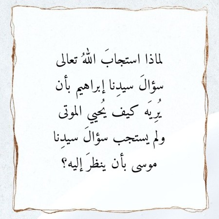 نوفمبر 27, 2023نوفمبر 28, 2023 Sufism24/7 لماذا استجابَ اللهُ تعالى سؤالَ سيدِنا إبراهيم بأن يُرِيَه كيف يُحيي الموتى ولم يستجب سؤالَ سيدِنا موسى بأن ينظرَ إليه؟