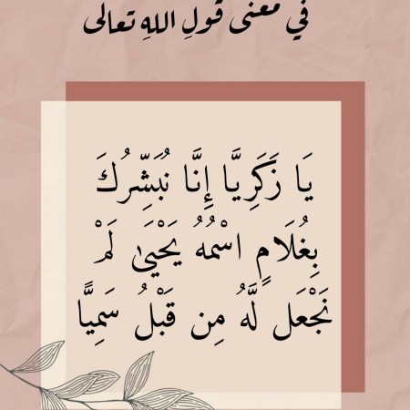 فيفري 18, 2022 Sufism24/7 في معنى قَولِ اللهِ تعالى “يَا زَكَرِيَّا إِنَّا نُبَشِّرُكَ بِغُلَامٍ اسْمُهُ يَحْيَىٰ لَمْ نَجْعَل لَّهُ مِن قَبْلُ سَمِيًّا”