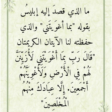 أكتوبر 11, 2021أكتوبر 12, 2021 Sufism24/7 ما الذي قصدَ إليه إبليسُ بقوله “بما أغوَيتَني” والذي حفظته لنا الآيتان الكريمتان “قَالَ رَبِّ بِمَا أَغْوَيْتَنِي لَأُزَيِّنَنَّ لَهُمْ فِي الْأَرْضِ وَلَأُغْوِيَنَّهُمْ أَجْمَعِينَ. إِلَّا عِبَادَكَ مِنْهُمُ الْمُخْلَصِينَ”