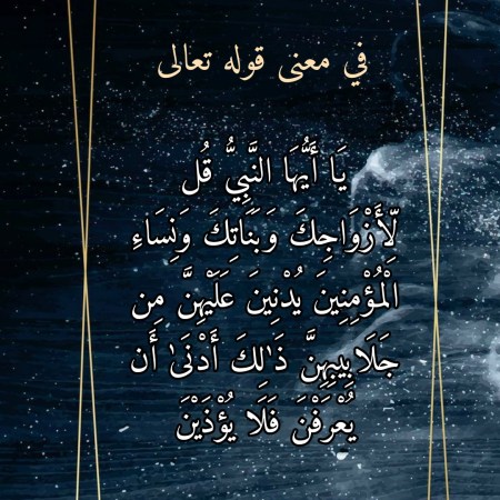 أوت 27, 2021أوت 28, 2021 Sufism24/7 في معنى قوله تعالى “يَا أَيُّهَا النَّبِيُّ قُل لِّأَزْوَاجِكَ وَبَنَاتِكَ وَنِسَاءِ الْمُؤْمِنِينَ يُدْنِينَ عَلَيْهِنَّ مِن جَلَابِيبِهِنَّ ذَٰلِكَ أَدْنَىٰ أَن يُعْرَفْنَ فَلَا يُؤْذَيْنَ”