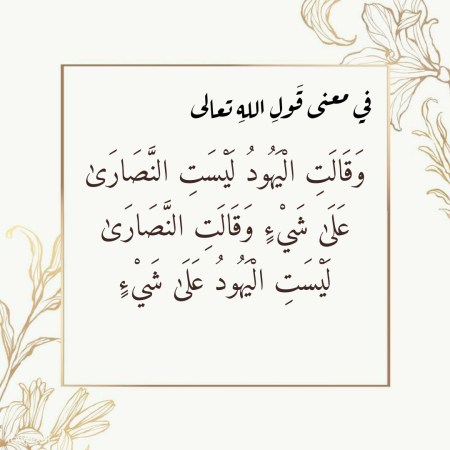 ماي 31, 2022 Sufism24/7 في معنى قَولِ اللهِ تعالى “وَقَالَتِ الْيَهُودُ لَيْسَتِ النَّصَارَىٰ عَلَىٰ شَيْءٍ وَقَالَتِ النَّصَارَىٰ لَيْسَتِ الْيَهُودُ عَلَىٰ شَيْءٍ”