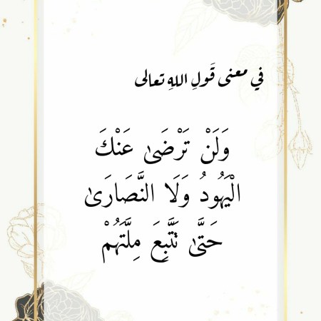 ماي 31, 2022 Sufism24/7 في معنى قَولِ اللهِ تعالى “وَلَنْ تَرْضَىٰ عَنْكَ الْيَهُودُ وَلَا النَّصَارَىٰ حَتَّىٰ تَتَّبِعَ مِلَّتَهُمْ”