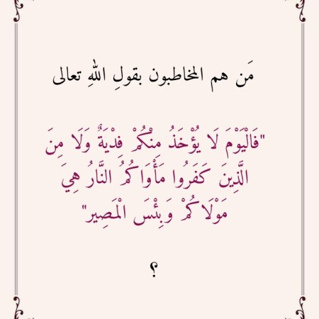 مَن هم المخاطبون بقولِ اللهِ تعالى “فَالْيَوْمَ لَا يُؤْخَذُ مِنْكُمْ فِدْيَةٌ وَلَا مِنَ الَّذِينَ كَفَرُوا مَأْوَاكُمُ النَّارُ هِيَ مَوْلَاكُمْ وَبِئْسَ الْمَصِير”؟