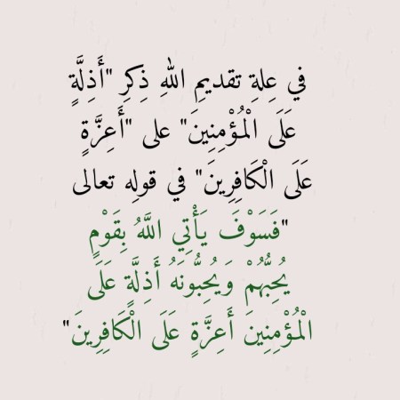 في عِلةِ تقديمِ اللهِ ذِكرِ “أَذِلَّةٍ عَلَى الْمُؤْمِنِينَ” على “أَعِزَّةٍ عَلَى الْكَافِرِينَ” في قولِه تعالى “فَسَوْفَ يَأْتِي اللَّهُ بِقَوْمٍ يُحِبُّهُمْ وَيُحِبُّونَهُ أَذِلَّةٍ عَلَى الْمُؤْمِنِينَ أَعِزَّةٍ عَلَى الْكَافِرِينَ”
