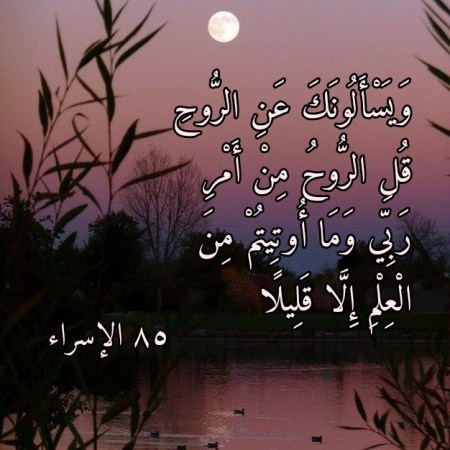 القرآن، وَيَسْأَلُونَكَ عَنِ الرُّوحِ قُلِ الرُّوحُ مِنْ أَمْرِ رَبِّي وَمَا أُوتِيتُمْ مِنَ الْعِلْمِ إِل