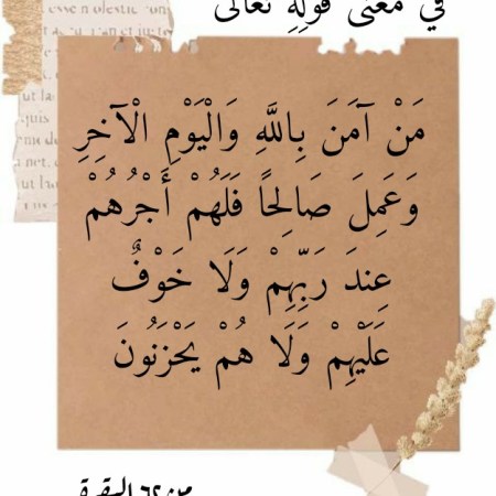 فيفري 24, 2021فيفري 27, 2021 Sufism24/7 في معنى قوله تعالى (مَنْ آمَنَ بِاللَّهِ وَالْيَوْمِ الْآخِرِ وَعَمِلَ صَالِحًا فَلَهُمْ أَجْرُهُمْ عِنْدَ رَبِّهِمْ وَلَا خَوْفٌ عَلَيْهِمْ وَلَا هُمْ يَحْزَنُونَ)