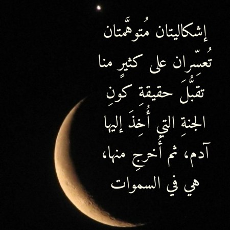 أفريل 25, 2021أفريل 26, 2021 Sufism24/7 إشكاليتان مُتوهَّمتان تُعسِّران على كثيرٍ منا تقبُّلَ حقيقةِ كونِ الجنةِ التي أُخِذَ إليها آدم، ثم أُخرجِ منها، هي في السموات