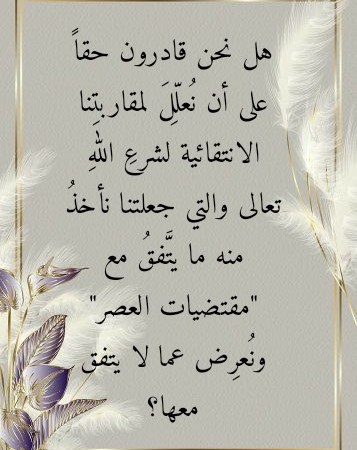 نوفمبر 12, 2020نوفمبر 13, 2020 Sufism24/7 هل نحن قادرون حقاً على أن نُعلِّلَ لمقاربتِنا الانتقائية لشرعِ اللهِ تعالى والتي جعلتنا نأخذُ منه ما يتَّفقُ مع “مقتضيات العصر” ونُعرِض عما لا يتفق معها؟